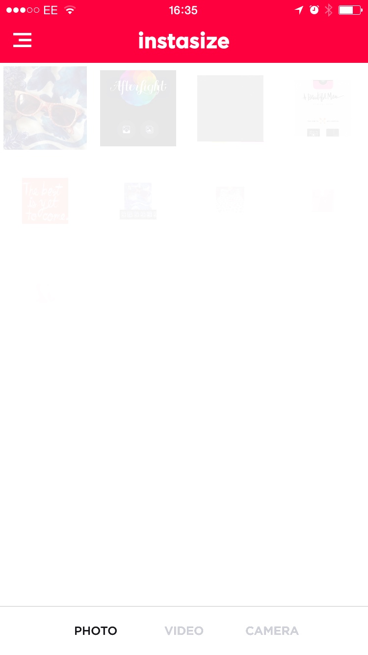Next up is Instasize. When you first open the app your photo library will open on the screen, along the bottom there is an option to switch from 'photo' to 'video' or 'camera'. Once you select your image it will put it in a box (screenshot on the right). I find this app best for when you don't want to crop any of an image to post on Instagram. For example, say you have a nice landscape image and you don't want cut anything out, you can pop over to Instasize and it will centralise your image in a box. You can then put filters on this, create a collage, add a border/background image, adjust, add stickers, text overlays or crop.